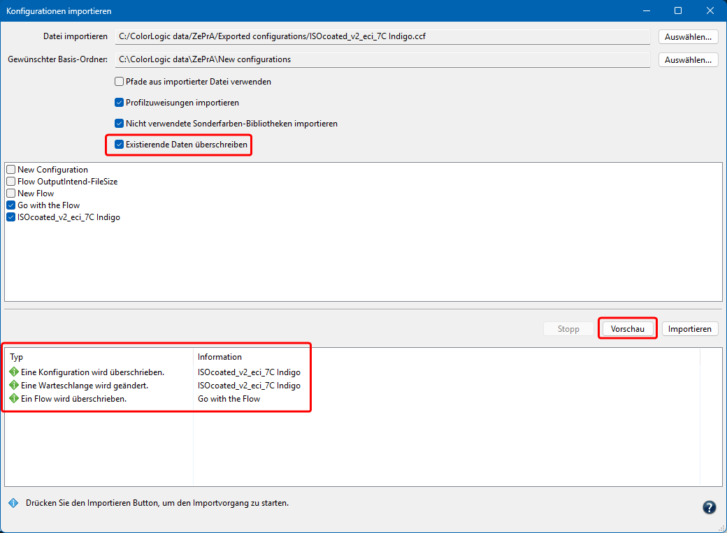 Beim Importieren von Konfigurationen und Flows über den Dialog Konfigurationen importieren werden bereits vorhandene Elemente, wie zum Beispiel Ordner, Konfigurationen, Flows, ICC-Profile, Sonderfarbenbibliotheken usw. standardmäßig nicht mehr importiert und überschrieben. Dies stellt eine Änderung gegenüber früheren Versionen dar, in denen solche Elemente überschrieben wurden, was nicht in allen Fällen erwünscht war.