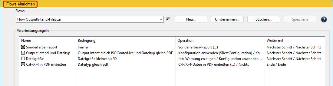 Flows können im Abschnitt Flows einrichten konfiguriert werden. Jeder Flow trägt einen Namen und enthält eine oder mehrere Verarbeitungsregeln. Ähnlich wie Konfigurationen können Flows mit oder ohne Warteschlange erstellt und auf vergleichbare Weise verwaltet werden. In der Übersicht sind Flows an einem orangefarbenen Symbol zu erkennen. Zur besseren Unterscheidung verwenden Konfigurationen ihr eigenes blaues Symbol.