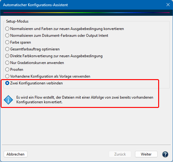 - Es kann nun auch eine Konfiguration mit Auto Setup erstellt werden, die für die Direkte Farbkonvertierung zur neuen Ausgabebedingung dient und bei der ein Grau-Farbraum als Dokument-Farbraum angegeben wird.