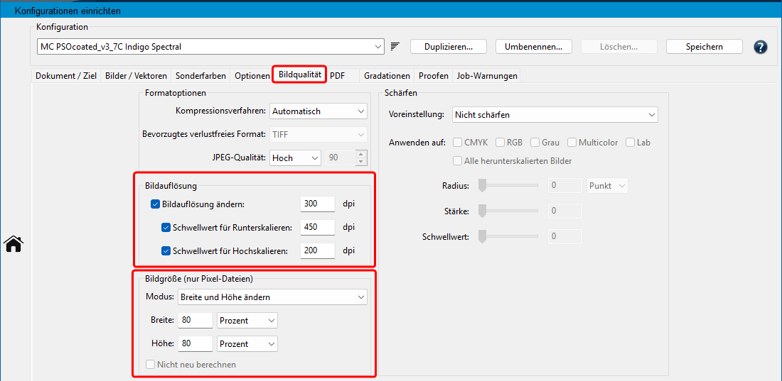 Unter Konfigurationen gibt es einen neuen Reiter namens Bildqualität. Alle mit der Bildqualität zusammenhängenden Aspekte, wie zum Beispiel die neuen Sektionen Bildauflösung und Bildgröße sowie bereits vorhandene Sektionen wie Schärfen und Formatoptionen, die sich bisher im Reiter Optionen befanden, sind nun hier vereint.