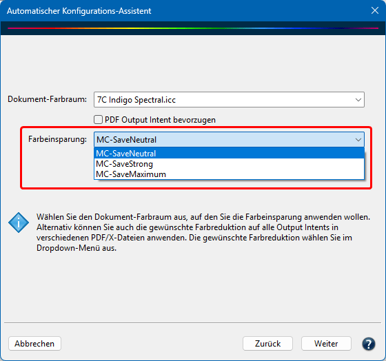 In ZePrA 13 stehen im Auto-Setup-Assistenten und unter Konfigurationen nun drei Voreinstellungen zur Verfügung, mit denen sich der Grad der Farbeneinsparung einfach auswählen lässt. Darüber hinaus können in CoPrA erstellte benutzerdefinierte Voreinstellungen mit ZePrA 13 geteilt werden (ab CoPrA-Version 11.1).