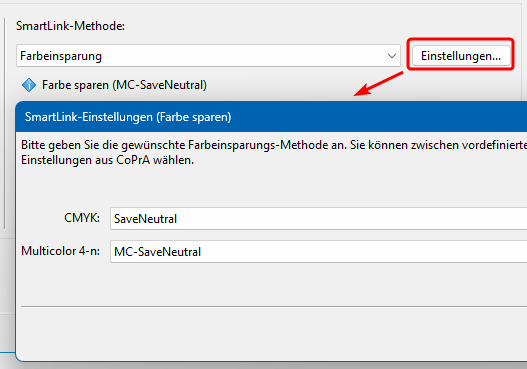 Für die SmartLink-Methode Farbeinsparung kann die SaveInk-Methode separat für die CMYK– und Multicolor-Kanäle (Multicolor 4-n) festgelegt werden.