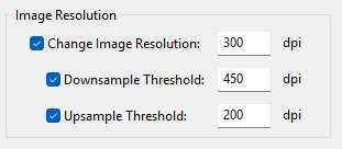 The new Image Resolution section allows changing the image resolution by adding thresholds for downscaling and upscaling. Previously, only a downscaling of the image resolution was possible; now, it is also possible to upscale it. The first checkbox defines the desired resolution and at least one of the threshold checkboxes must be enabled.