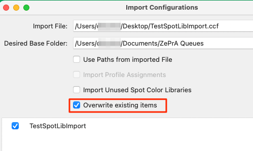 - Minor issues with the new Overwrite existing items checkbox in the Import Configurations dialog have been fixed, which caused spot color libraries to not display correctly under certain circumstances in the Preview.