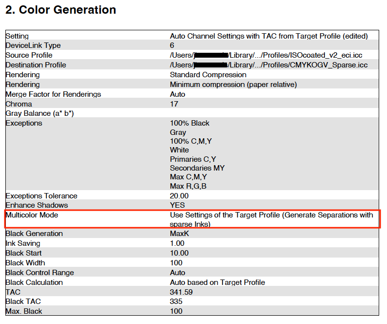 The report now includes the used Multicolor Mode. In addition to the user-defined modes (Strong, Smooth, Generate Separations with sparse Inks, Use CMYK only, Preserve Color Properties) when using the mode Use Settings of the Target Profile the report includes the used mode from the target profile in parentheses